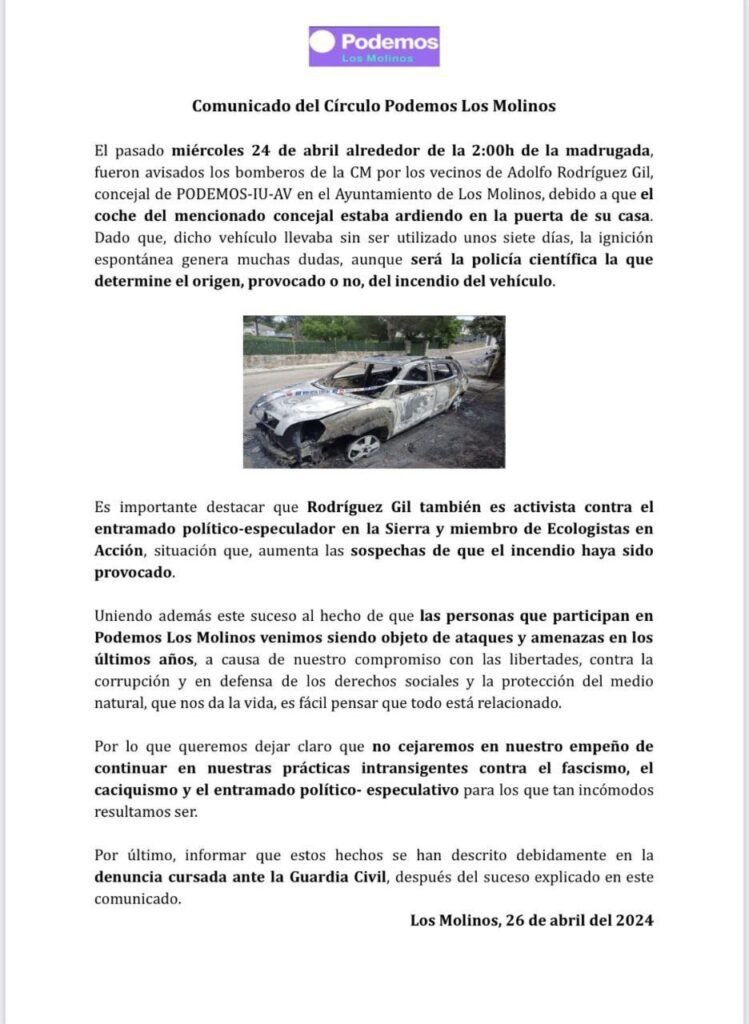 Ecologistas en Acción ha pedido una exhaustiva investigación porque se sospecha que el incendio del coche de Adolfo no fue fortuito.