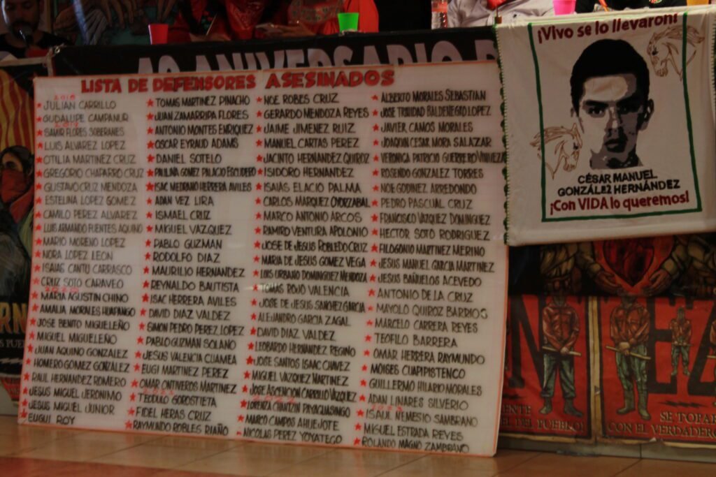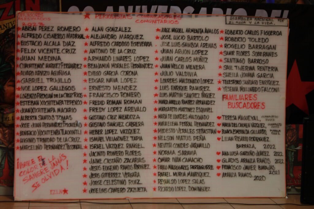 Hacemos nuestras las exigencias por la libertad de todxs lxs presxs políticxs; exigimos la inmediata presentación con vida de nuestros 43 Normalistas de Ayotzinapa, desaparecidos forzadamente por el Ejército y los más de 116 mil desaparecidos en México, justicia para Verónica Guerrero, Justicia para Samir Flores Soberanes y todos los defensores del territorio, periodistas, mujeres y madres buscadoras asesinadas.