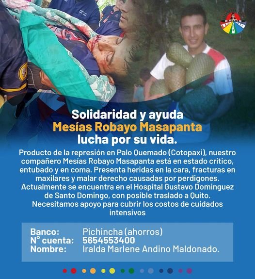 Desde el Frente Nacional Antiminero, aliados a la CONAIE y a las demás organizaciones sociales hacemos un llamado fuerte a todo el país, a todas las organizaciones, a la sociedad civil en general a despertarnos, a activarnos y a retomar la senda de la lucha porque si no, estos ricachones van a hacer lo que les de la gana con el país, nos van dejar peor endeudados, entregados a las empresas mineras y por supuesto mas empobrecidos, más contaminados y sin solucionar los principales problemas del país como es la delincuencia que está cada día peor mientras la policía y el ejercito están amedrentando a nuestros compañeros y compañeras en las zonas de resistencia.”
