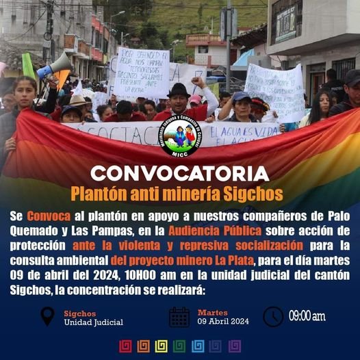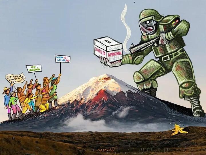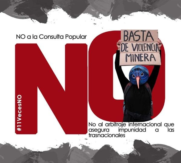 Y ahora en la consulta popular que impulsa el gobierno para enmendar la constitución no se debe votar a favor de las preguntas porque están relacionadas al tema minero; como la relacionada a la protección de inversiones que es justamente para estas empresas que lo hacen todo mal, violan todas las leyes, violan todos los procesos, son absolutamente ilegitimas y cuando les toca irse porque la gente las bota, cogen y le demandan al estado, y el estado feliz de la vida les paga millones de dólares. Eso ya lo vivimos en la zona de Intag hace 14 años con Ascendant Copper, entonces no podemos repetir el mismo error, una y otra vez, como país.