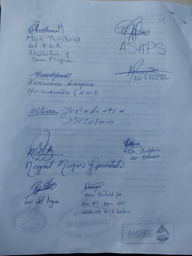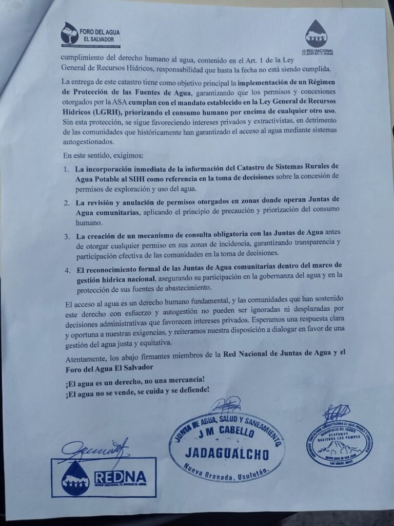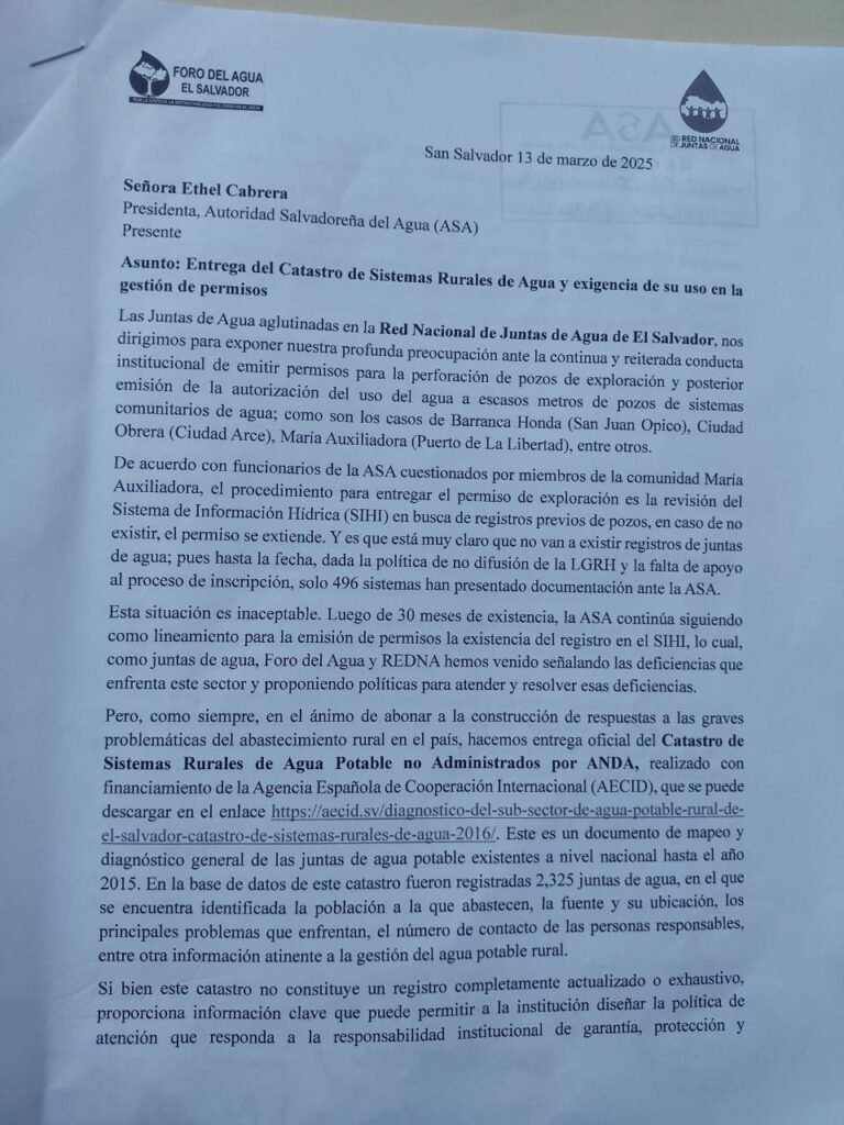 El día 13 de marzo, integrantes del Foro del Agua, que agrupa a 200 Juntas de Agua de 8 departamentos del país, presentaron una carta ante la Autoridad Salvadoreña del Agua (ASA) para exigir se respete su derecho al agua.